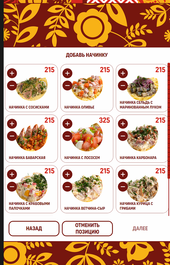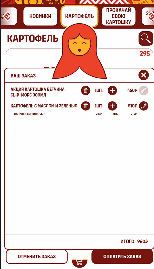 Полнофункциональная корзина Возможность менять заказ из корзины Подсчета суммы заказа по мере наполнения корзины Экран с подтверждением отмены заказа по таймауту Добавление блюда в заказ по сканированию QR кода, штрихкода Доп.возможности при интеграции