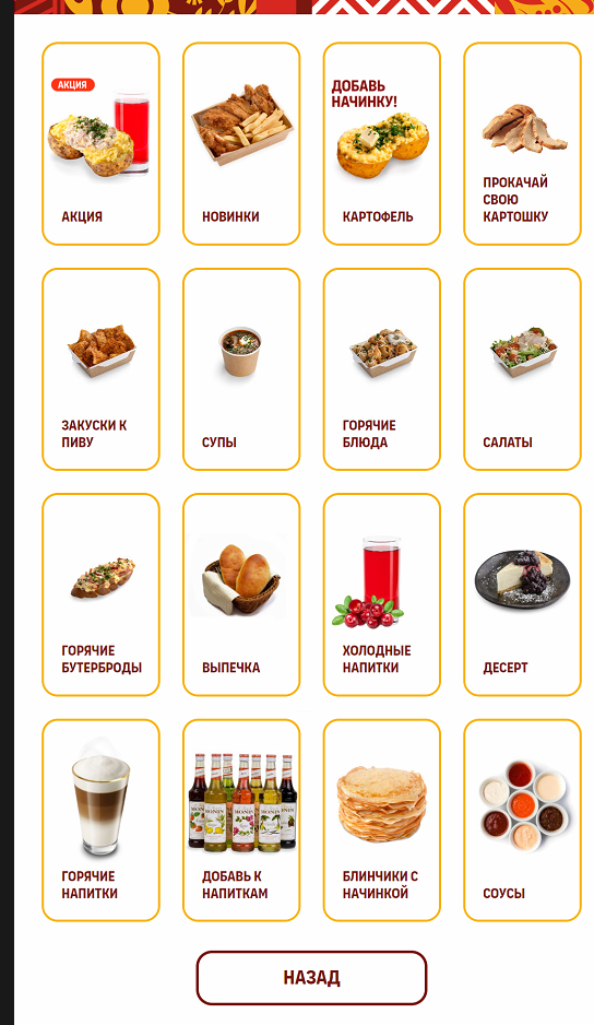 Стикеры для продуктов (новинка, акция, острое, вегетарианское и т.п.) Реклама на стартовом экране (смена изображений по таймеру или видео) Кликабельные баннеры вверху экранов