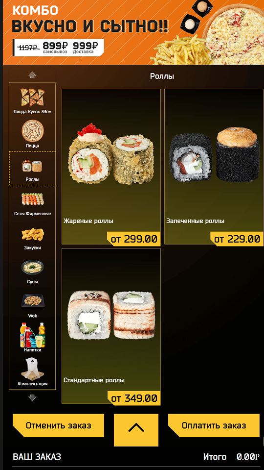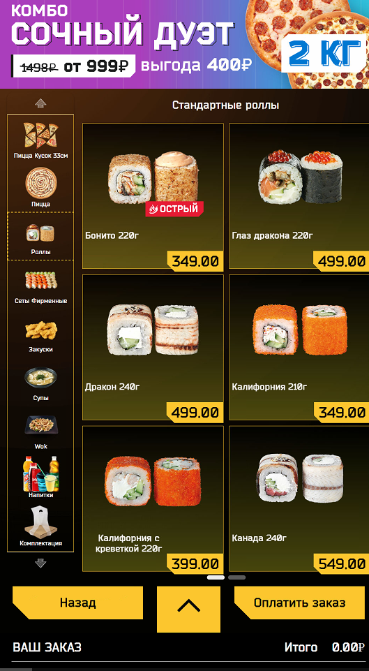 Выбор получения заказа: В зале или На вынос Карусель с разделами меню Отображение описания блюд Поддержка комбо блюд Выбор размера блюд и добавление ингредиентов, связанных с данным блюдом Увеличение/уменьшение количества каждого наименования для добавления в корзину.